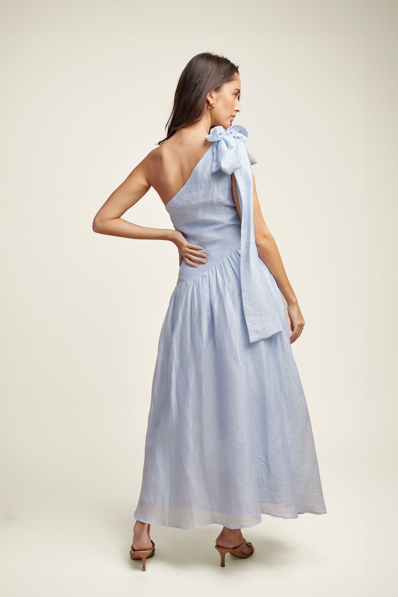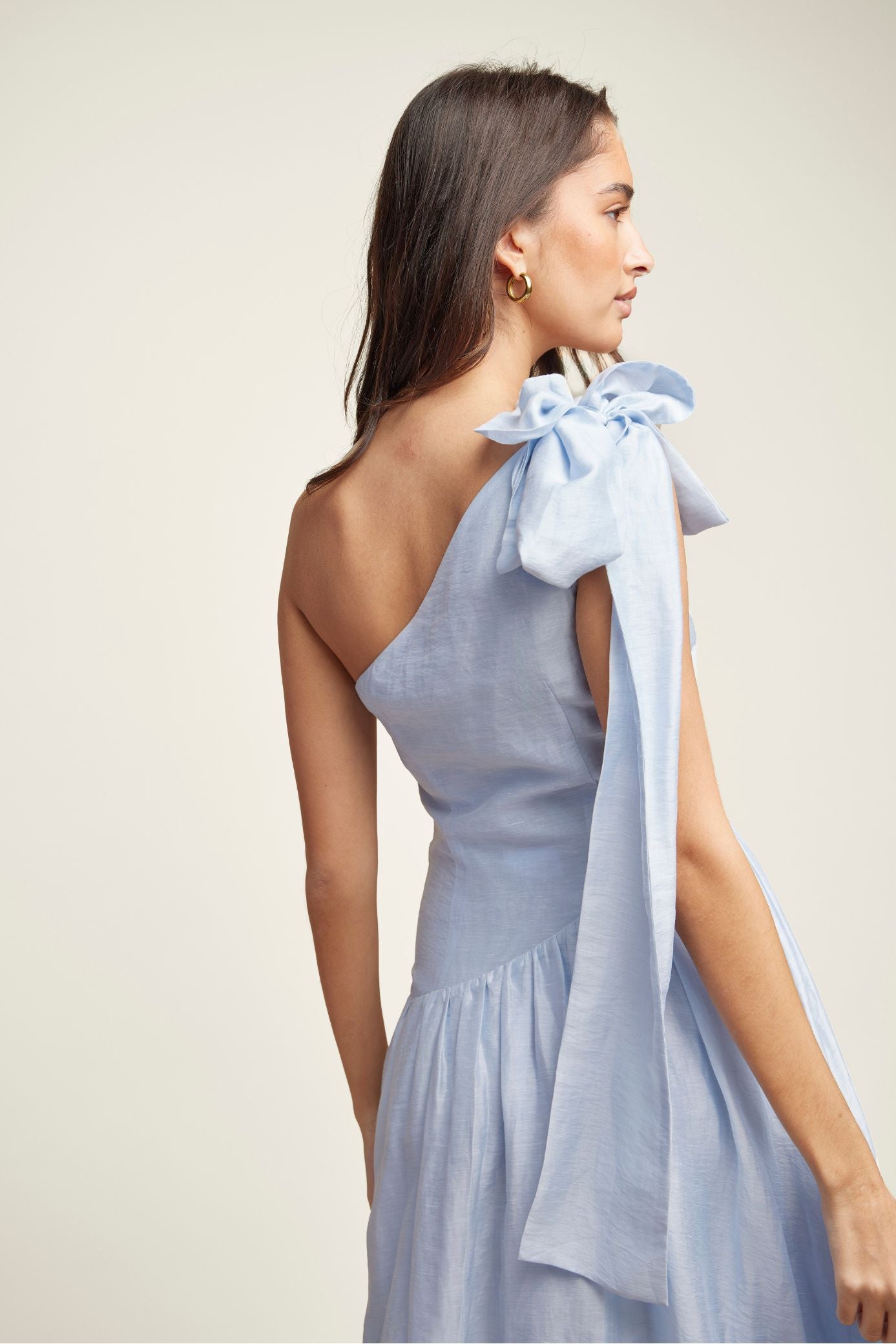 The Arco Maxi Dress features a sophisticated and graceful design that combines modern elegance with timeless charm. This dress is made from a soft, breathable fabric that drapes beautifully over the body, enhancing the wearer’s natural silhouette. One-shoulder design with a large bow, a flowing skirt, and smooth, slightly textured fabric adds to its unique appeal.