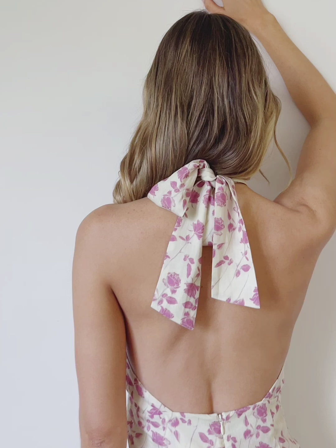 The Lorraine Dress is a captivating and sophisticated garment that exudes a sense of elegance and enchantment. Designed to make a statement, it combines pink floral prints with a halter neck and backless details create a look that is both striking and graceful in this Lakeyo dress.